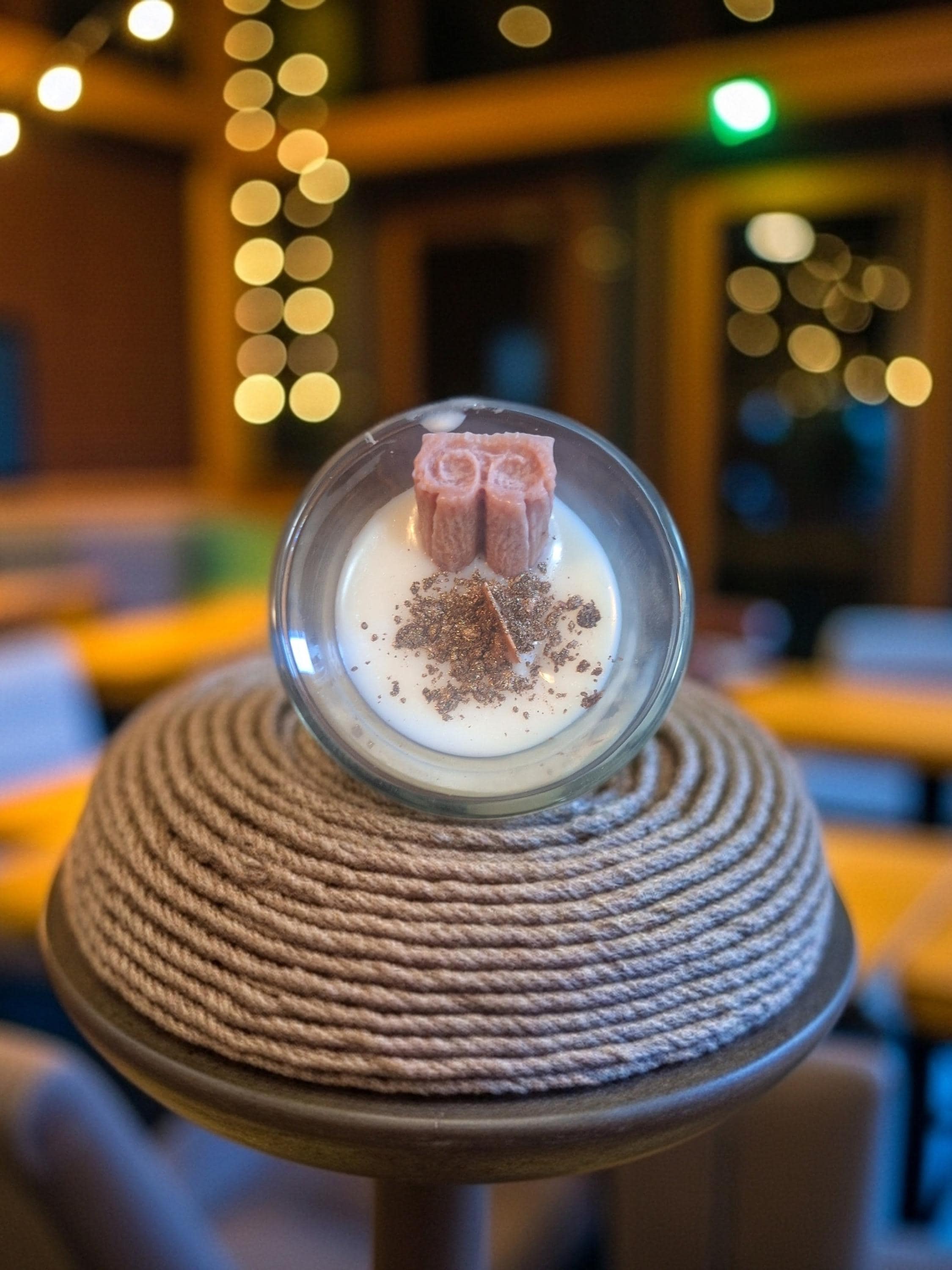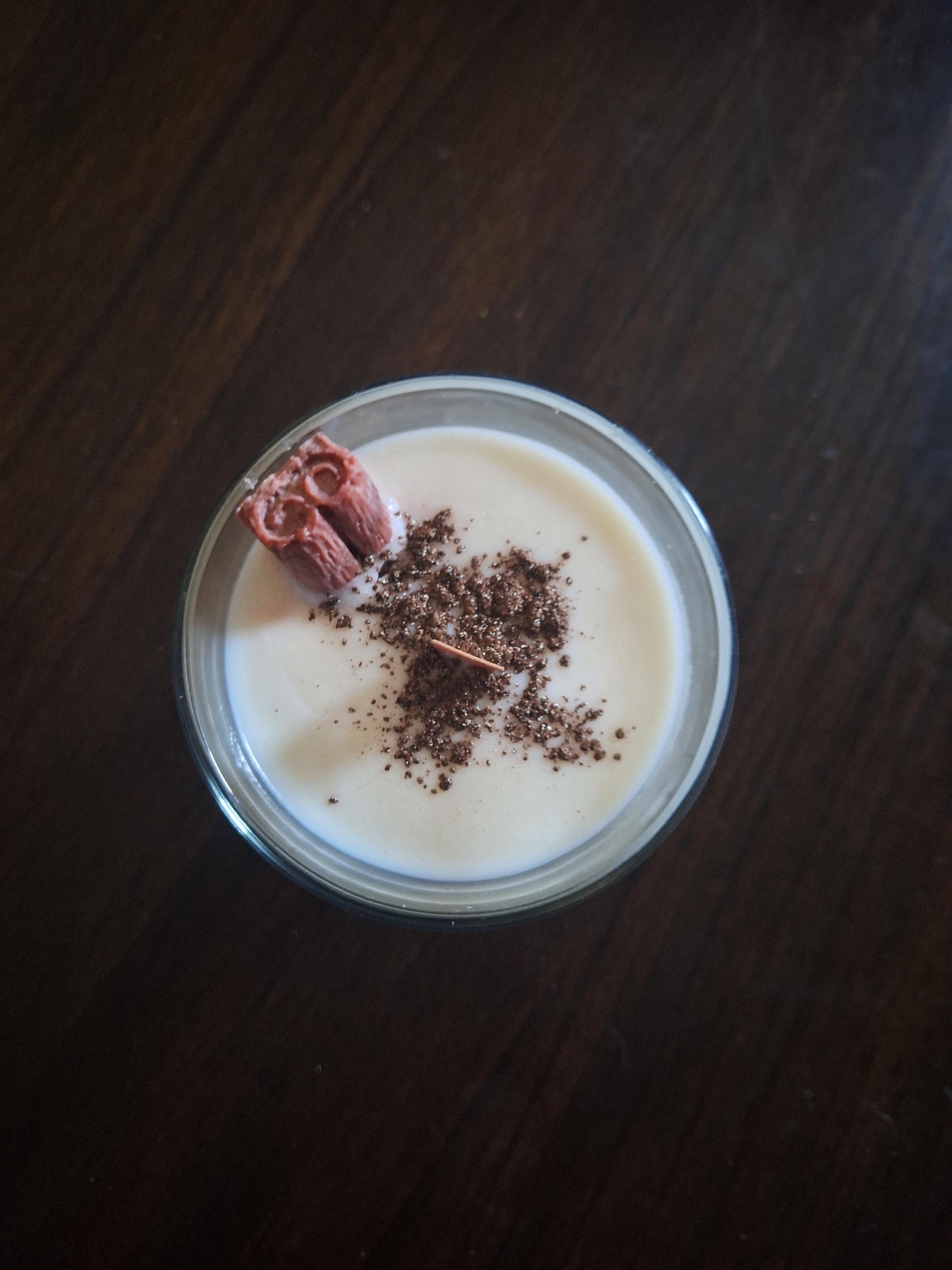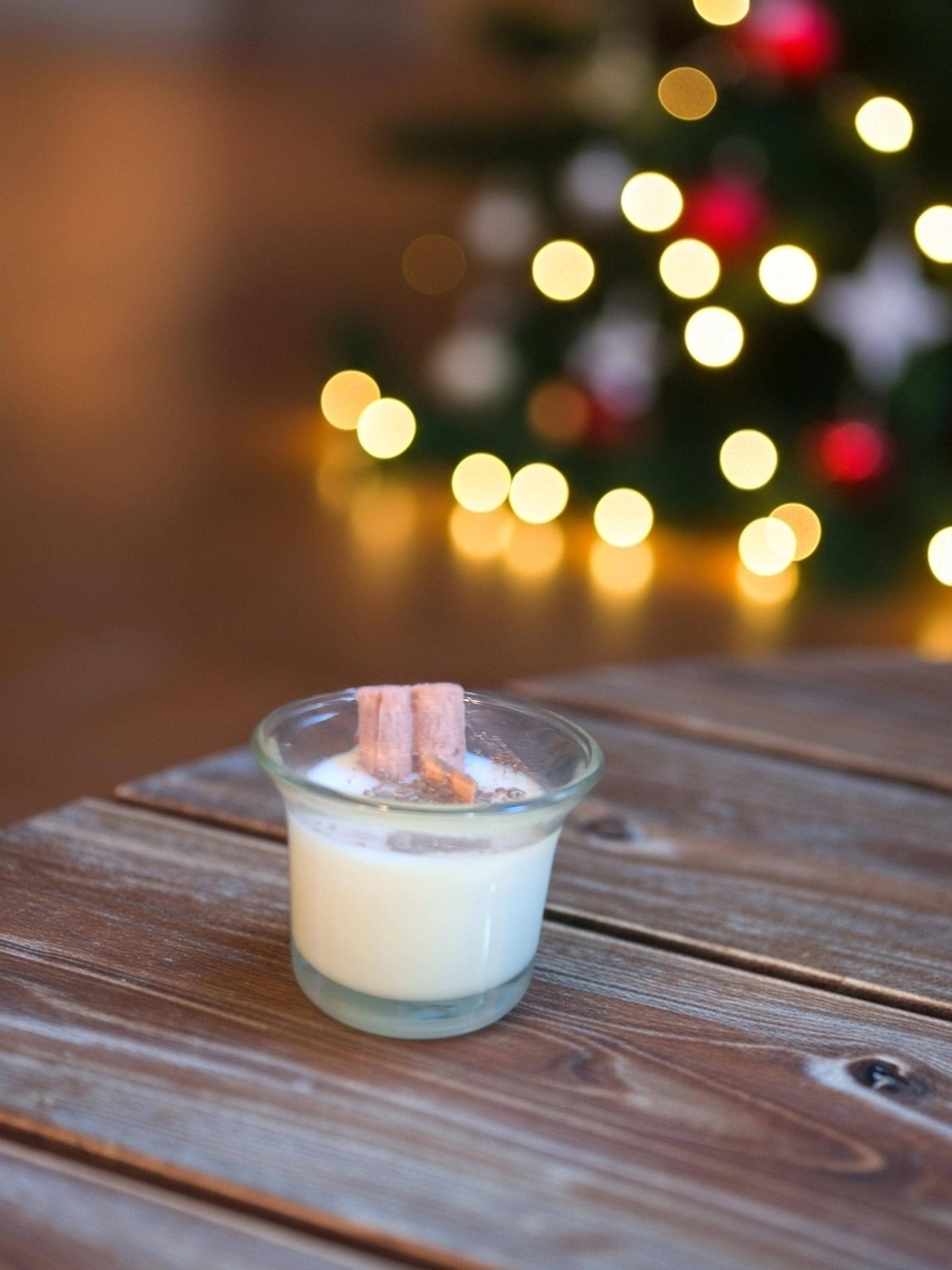 A coquito-scented shot glass sized candle is a festive and creamy fragrance that evokes the traditional Puerto Rican holiday drink, blending notes of coconut, rum, and warm spices like cinnamon and nutmeg. It aims to create a cozy and nostalgic atmosphere, often made with a soy or coconut wax blend for a clean burn. This candle brings back the nostalgic "back home" christmas feeling.