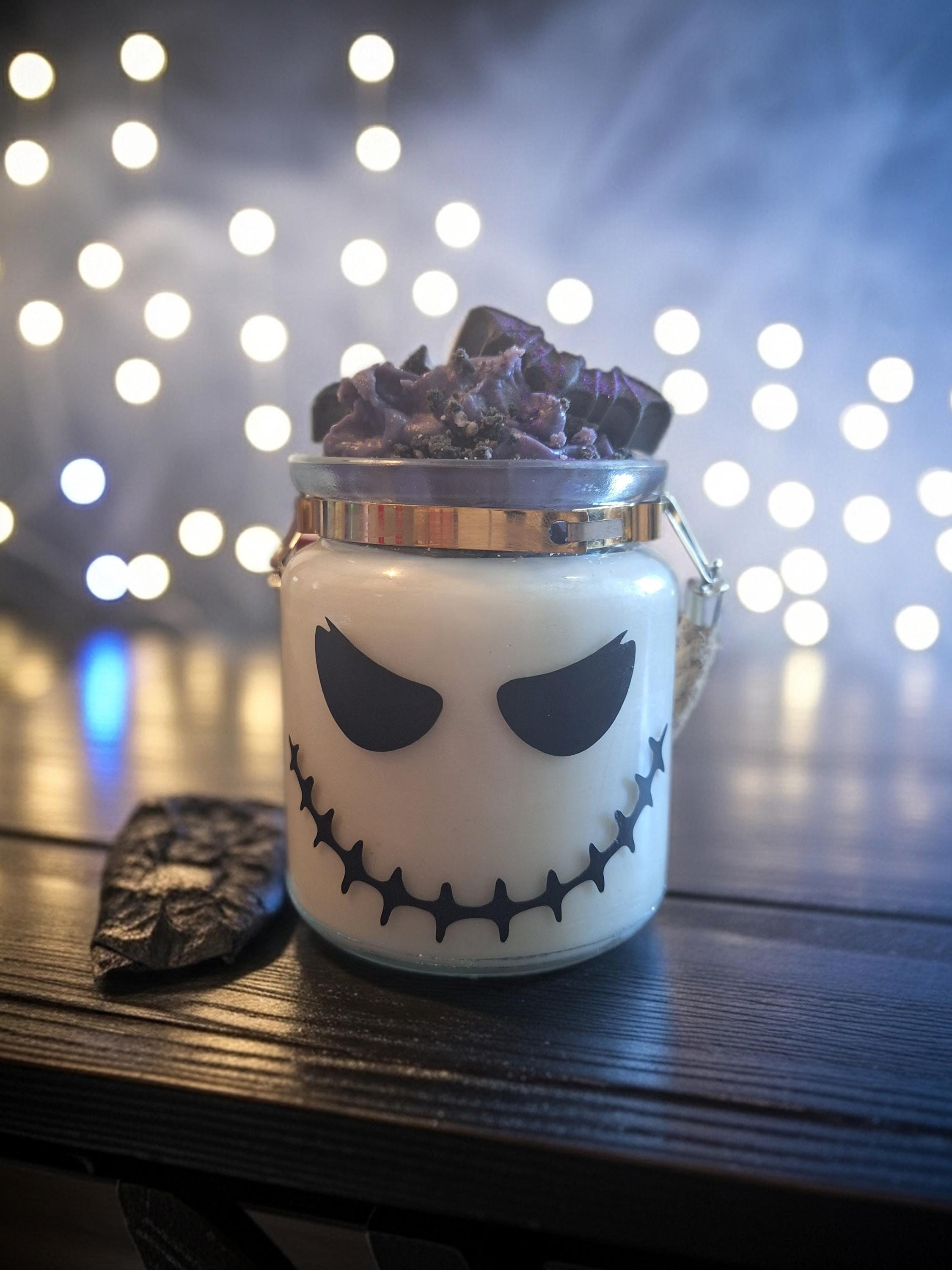 A Tim Burton-inspired lemon and lavender candle offers a quirky, cozy mix of bright citrus and calming florals, evoking Nightmare Before Christmas vibes with hints of moss, cedar, or even "witchy" gourmands, creating a spooky-cute atmosphere perfect for dark academia or Halloween decor, often in themed jars or tins with notes like lemon, bergamot, and lavender.